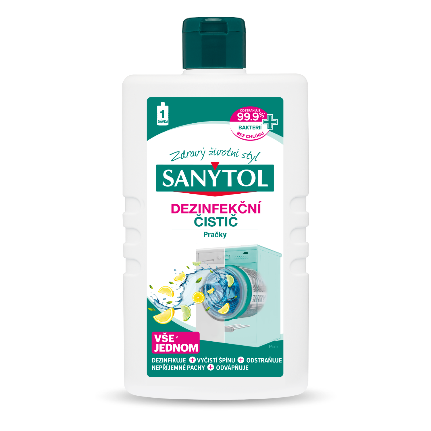Dezinfekční čistič pračky Při častém praní se zbytky pracího prostředku, nečistot a vodního kamene usazují v pračce. Časem tyto usazeniny vytvářejí nepříjemný zápach a snižují výkon vaší pračky. Dezinfekční čistič pračky SANYTOL ničí 99,9 % bakterií. Jeho složení vše v jednom vaši pračku čistí, dezinfikuje, odstraňuje usazeniny a zbavuje zápachu, a tím prodlužuje její životnost.